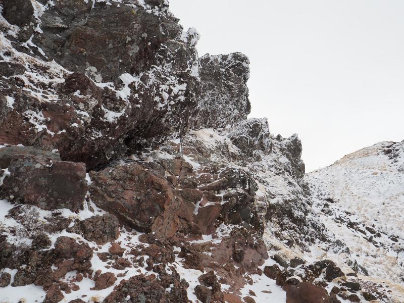 さてさて帰りますか。帰りもテクニカル。帰りはエネルギーも足りなくなってきて、なかなか足が上がらなくなってきてしまいペースが落ちてちょっと時間かかってしまいました。下りは標高2100mくらいで12本爪アイゼンからチェーンスパイクに換装。