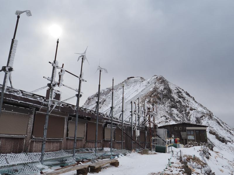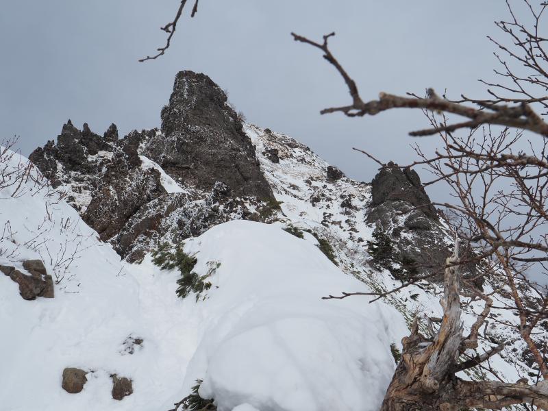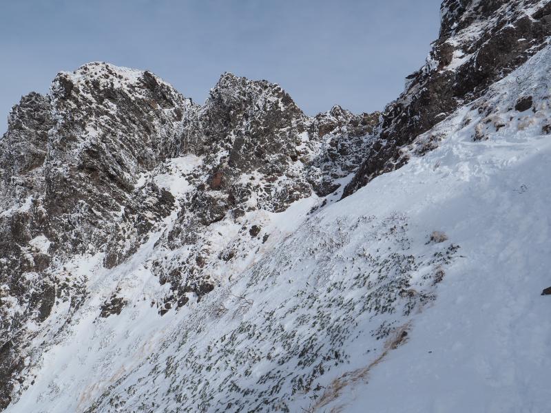 ・赤岳天望荘〜赤岳は雪が少なく岩が出ていたり岩の上に薄く雪が乗っている。