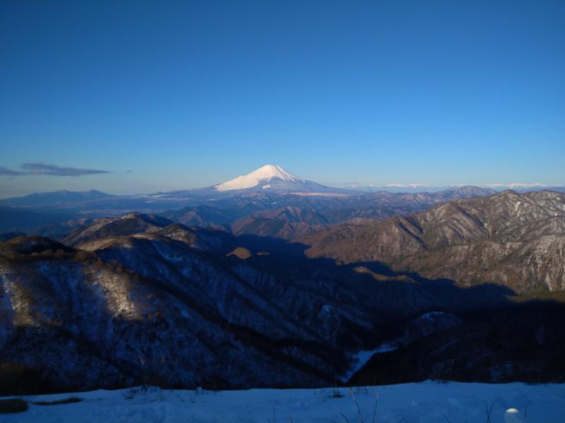 二ノ塔尾根がやや踏み跡が交錯している場所もあるのですが登りなら上を目指すので夜間でもしっかりと踏み跡を見て歩けばそれほど難しくはないでしょう。表尾根は夜景がとてもキレイに見える場所が多く流れる夜風もとても気持ちの良い稜線が楽しめました。今回は積雪もあったので速度は抑えめで。崩落部分と岩場、鎖場は昼間より慎重に確実に。とくに行者岳と政次郎尾根の間の鎖場がこのルートで一番丁寧に下りました。夜&雪なので些細なミスも命取りになりかねません。 塔ノ岳では早朝の澄んだ空気のなか景色を楽しむことが出来ました。主脈、南アルプス、北アルプス、八ケ岳、愛鷹、伊豆、箱根、三浦、房総、筑波と広範囲を見渡せる素晴らしい場所です。ただ、風が抜けることも多い場所なので気温の低いときにはゆっくりし過ぎは禁物です。