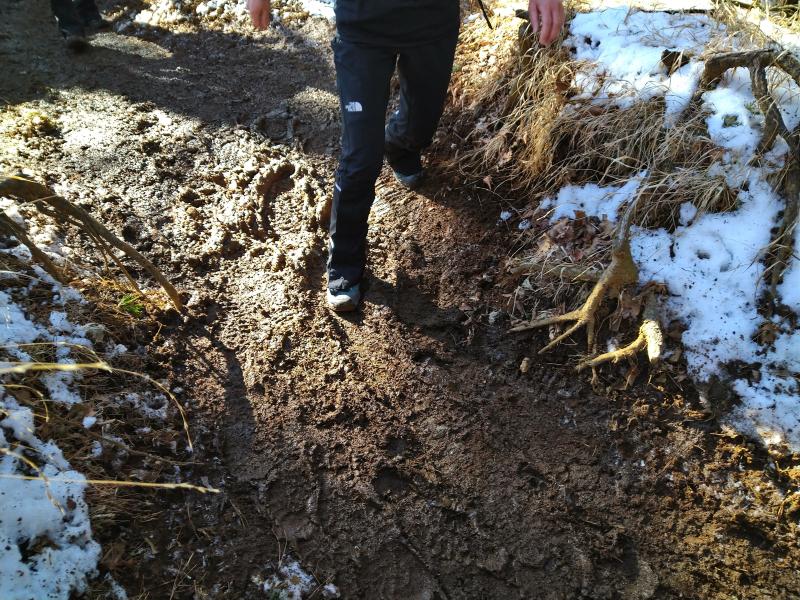 ・大倉尾根 堀山の家より上で積雪。アイゼンの付け所は適宜判断で。陽当りが良い場所が多いので融雪が早そう。堀山〜見晴らしは泥濘が酷い。