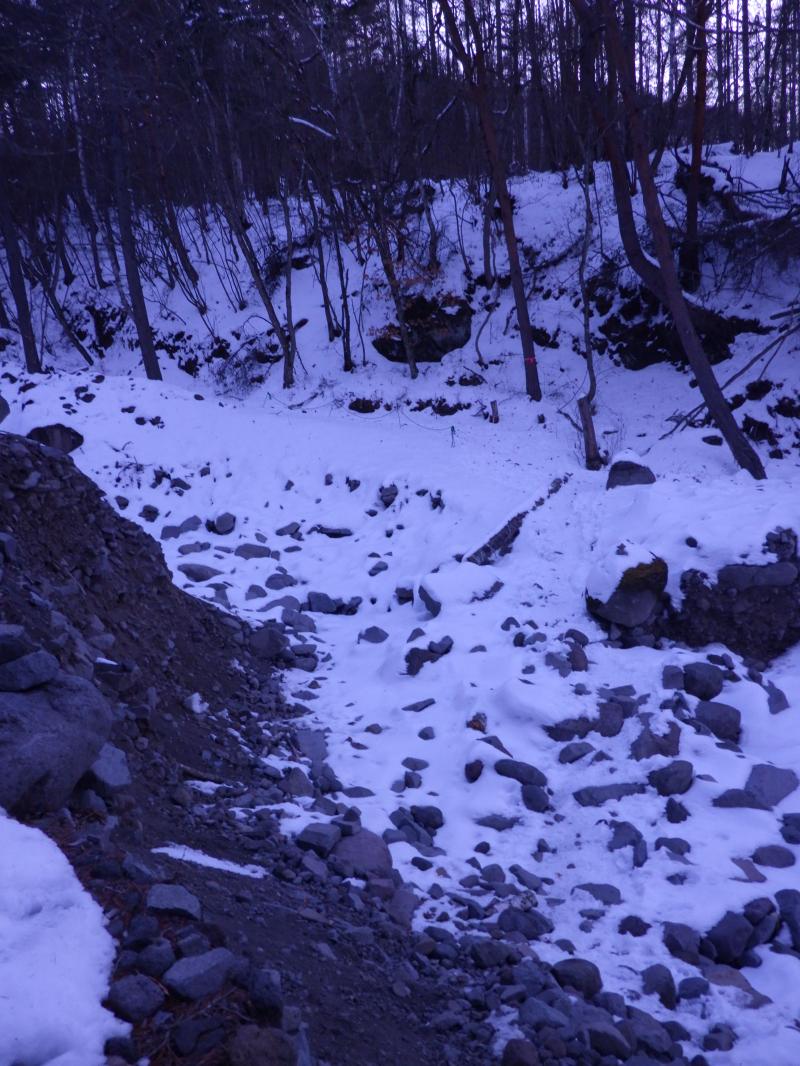 ④盃流しで沢を渡りますが、水はない河原でこの先はやや雪が多くなりますが、それでもトレースがしっかりしていて、ノーアイゼンかチェーンアイゼンにて充分