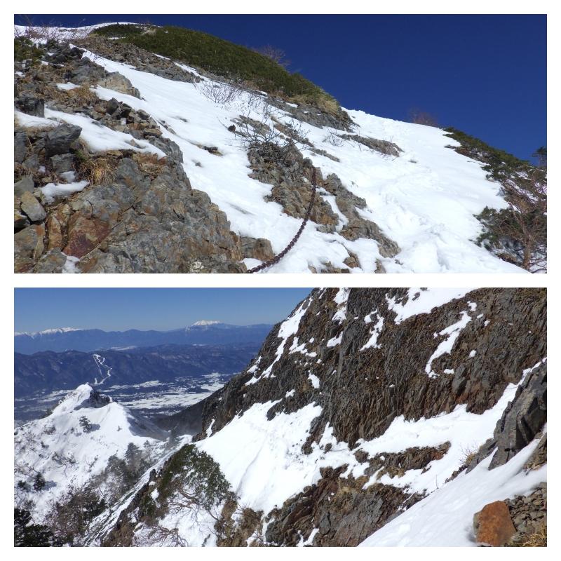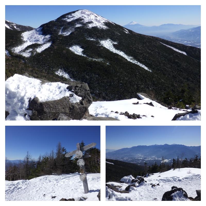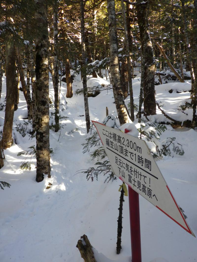 富士見高原スキー場上の駐車場まで全く雪がなく、ノーマルタイヤでも問題なさそうなアプローチで今年の雪の少なさが物語ります。今回は雪不足でさらに連休明けということでトレースもあるだろうと予想して、編笠山と西岳周回と権現岳に向けて行けるところまで行くつもりで出発します。盃流しを越え、尾根に移ると、完全に雪道になりますが、柔らかな雪でトレースもあるのでノーアイゼンで進みます。この登山道は緩やかに登って行きますが、標高差100m置きに出てくる親切な看板があり、ある程度目安にできます。樹林帯を抜けると、岩石帯になり、今日は雪が全くかぶっていないので、ノーアイゼンの為に逆に岩の上を伝って行きましたが、ここはチェーンアイゼンがあってもいいかなという箇所です。編笠山はアルプス・富士山・これから向かう権現岳と360度パノラマの山頂ですのでしんどい思いをしてのこの展望は癒してくれることでしょう。しかし、強風で撮影するとすぐに風下へ逃げます。