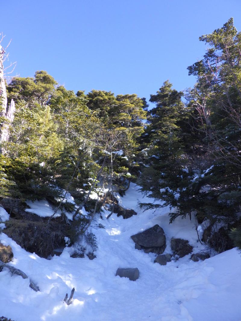 ⑥樹林帯を抜けたところで岩石群、岩は夏と同じ状態で凍結も濡れもないのでノーアイゼンの方が歩きやすかったです。