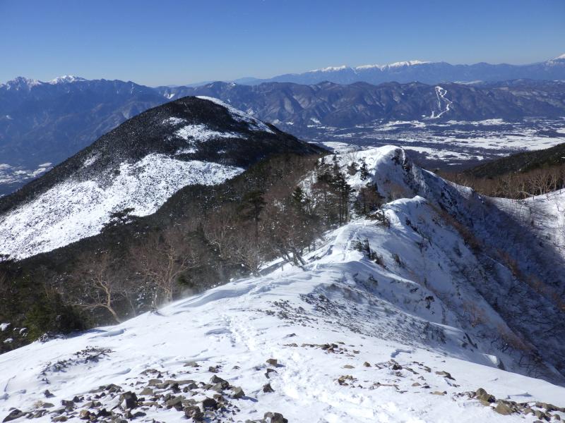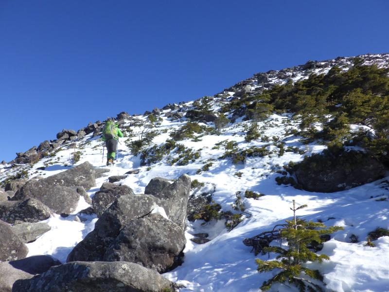 ⑨青年小屋からノロシバまで樹林帯の中でトレースが強風で消え気味ですが、あまり埋まらず。ノロシバから先はだんだんヤセ尾根になります。