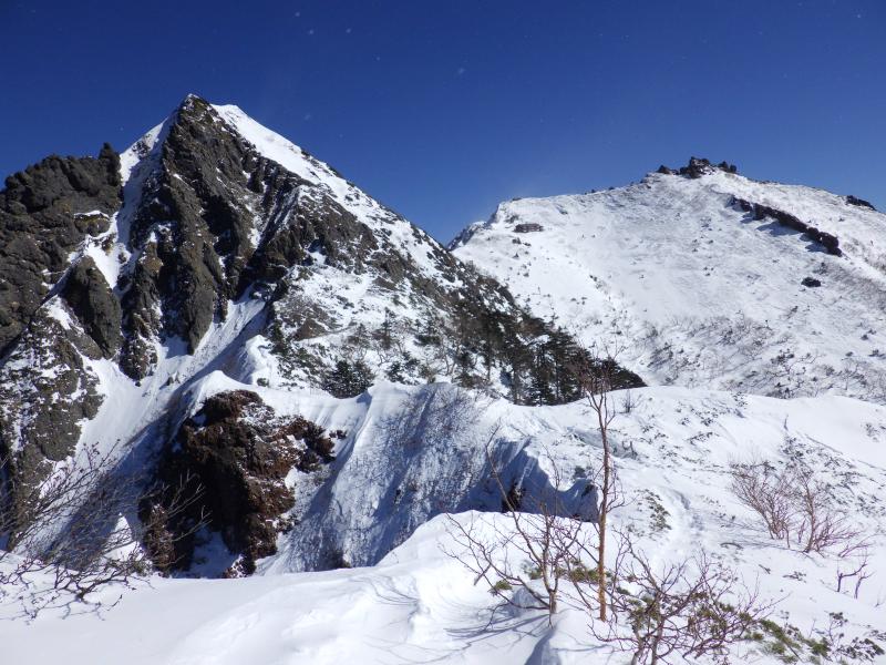 西ギボシの雪壁部分の鎖は埋まり、アイゼンを利かしながら登っていきますが、なんせ予報では17mほどの強風の為に下から吹き上がる雪の粒が顔に当たって痛く、時間がかかってしまいます。西ギボシまで上がるとようやく、東ギボシのトラバース部分がはっきり見えました。時間切れが迫ってきましたが、とりあえず、危険個所を抜けて、向こう側まで行ってみることにして進みます。しかし、西ギボシから鞍部まで下る箇所が雪庇を気にして、やや尾根の下を進むと腰まで埋まり、ここでも時間を費やしました。