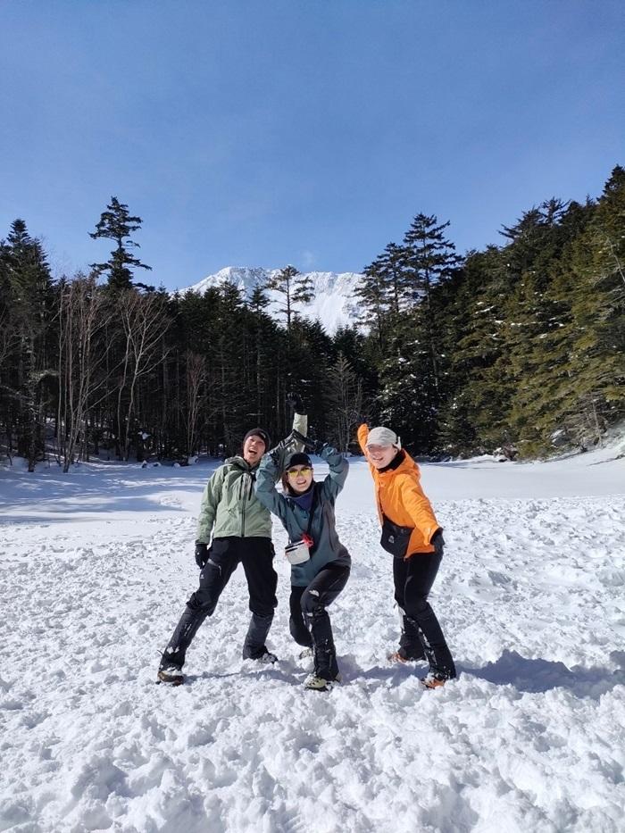 - ☆ストック+雪山用登山靴+12本アイゼン+ワカンを持っていきましたが、既に30人以上の人が入っていたようで道が踏み固められていたため、ストック+雪山用登山靴のみ使いました。軽アイゼン/チェーンスパイク+ストックの方が多かったです。ワカン/スノーシューは念のためあった方がよいと思います。
