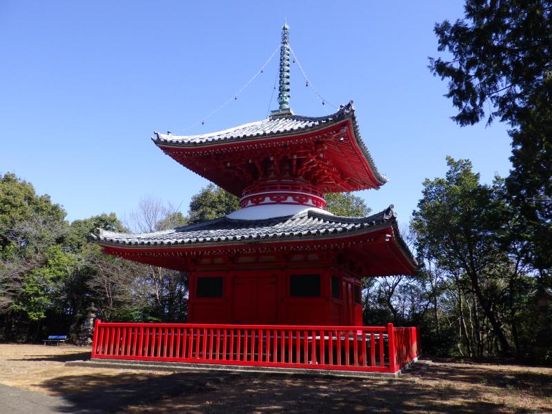 数分で見覚えのある分岐で、ココを下ればヒトツバタゴ自生地ですが、今回は尾張信貴山(おわりしぎさん・201m)へ向かいます。1584年の小牧山の合戦時に豊臣秀吉が陣を設けていたのがこの信貴山ですが、現在は昭和7年に奈良の毘沙門天の総本山・朝護孫子寺より勧請したといわれる信貴山泉浄院があり、本堂からは市街が広く見渡せます。この本堂あたりが信貴山となるでしょうが、山頂標識はありません。神社によくある狛犬が犬ではなく、虎になっているのが面白いです。駐車所側の多宝塔も2020年に塗り替えられたそうで赤が際立っていました。