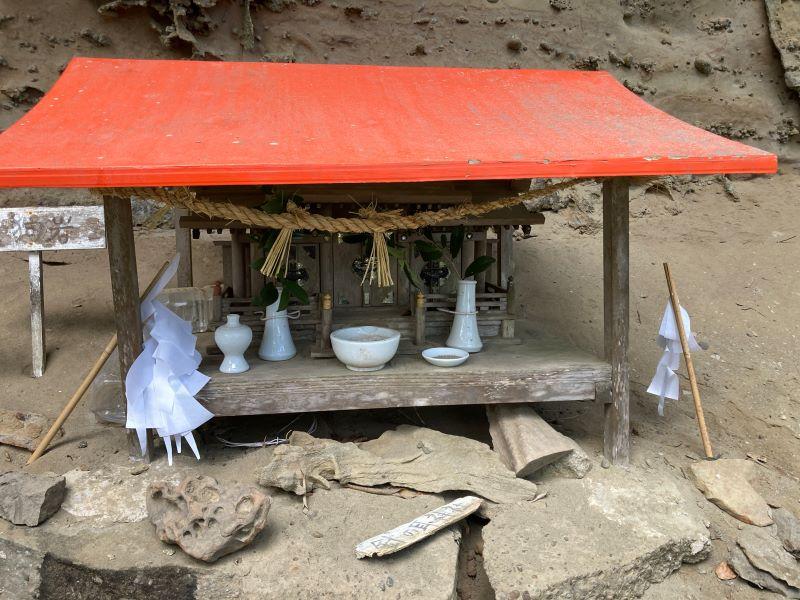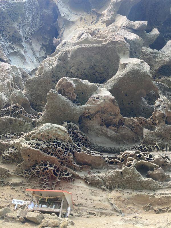 蜂の巣のように穴の開いた奇岩。針の耳神社が祀られています。