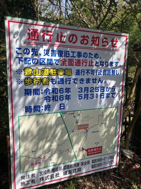 最短で登れる花切山登山口は日南市側からアクセスすることになるのですが、林道の入り口に通行止めの看板が立っていて一瞬固まってしまいました。
