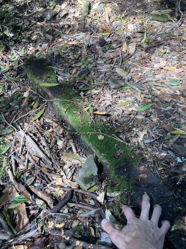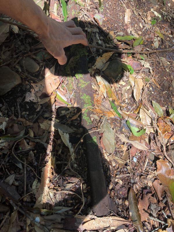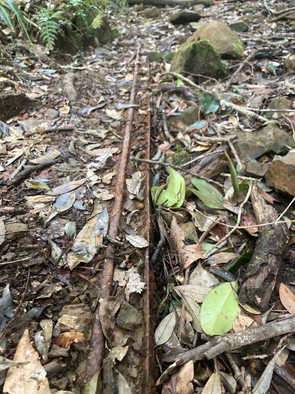 登山道を作るためにわざわざそこまでしたのか?と不思議に思いましたが、どうも森林鉄道の支線跡のようで、よく見ると枕木やレールの遺物が転がっているのが見つかりました。犬釘が残されているものも!