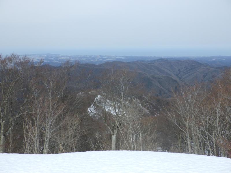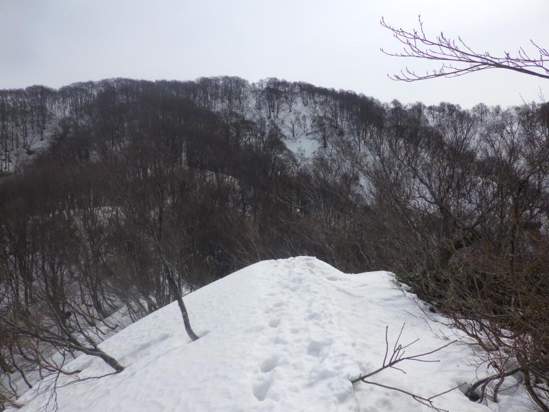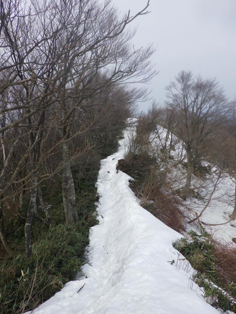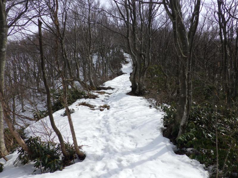 一番メジャーな我谷コースを選択、富士写湖から標高差740m、我谷吊橋の上から見える右側の山を目指します。尾根は広い登山道だが前半は虎ロープがある急登が3回続き、結構こたえるのでは?。この急登を終えると中間点という標識で、その上くらいから雪道になります。661mの小ピークに飛び出すと、小松の街並みと日本海が見え、山頂の稜線もはっきり見えます。ここからしばらく傾斜は緩やかですがシャクナゲ帯の細い尾根で、道を外すと埋まる雪質ですが、まだこの時間ならトレースをたどれば埋まらない感じです。