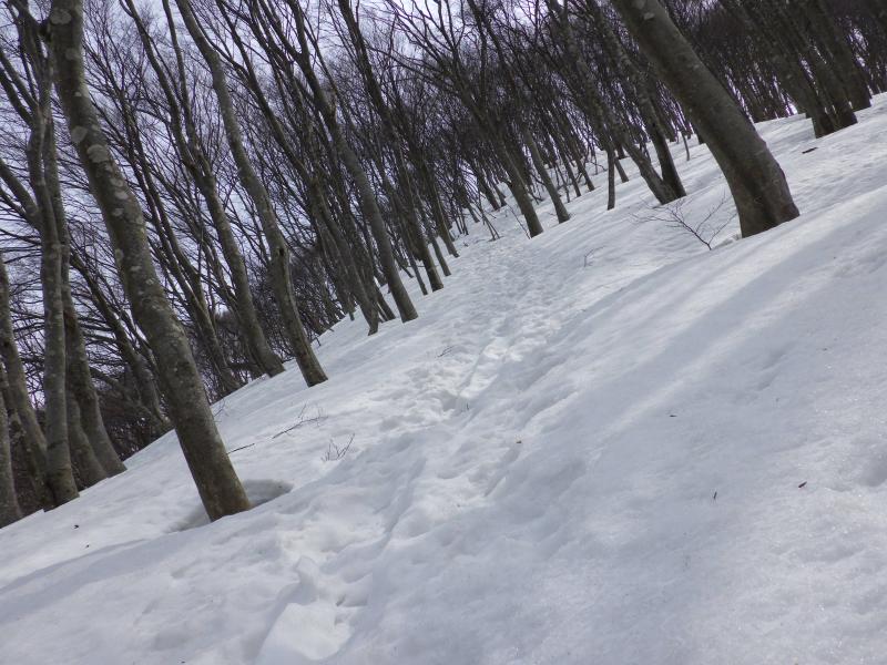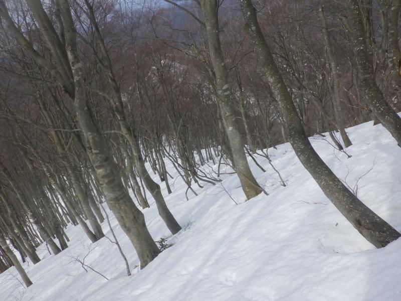 西から天気が悪くなってきているのでその予兆で雲が出てきたので、すぐさま引き返します。先ほどの雪壁部分は下りも一気に走り抜け、はまらず埋まらずでツボ足には最高の雪質。しかしながら、下るにつれて、前半の急登部分は逆に雪がないので、滑って滑って、歩きずらく、慎重に下ります。