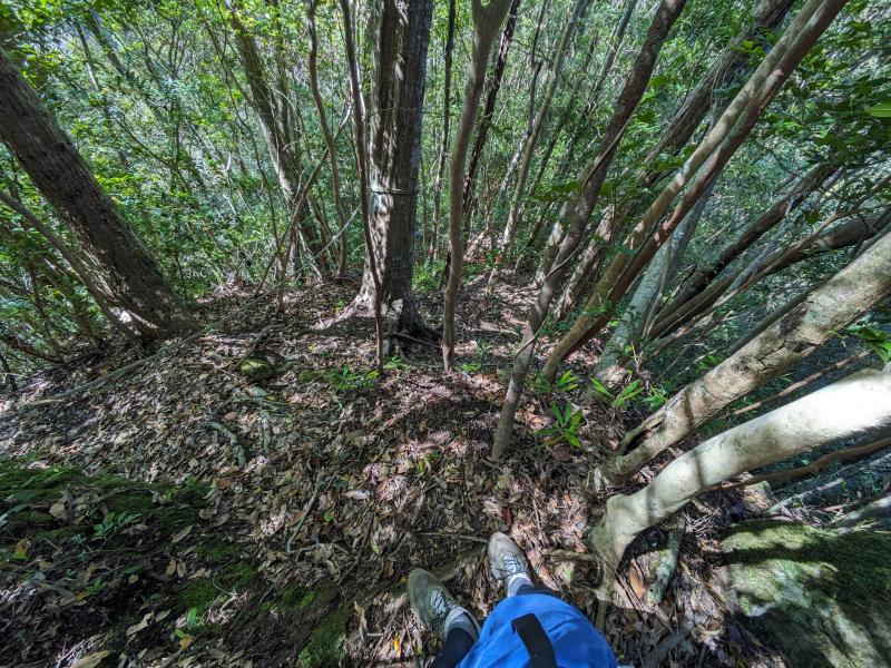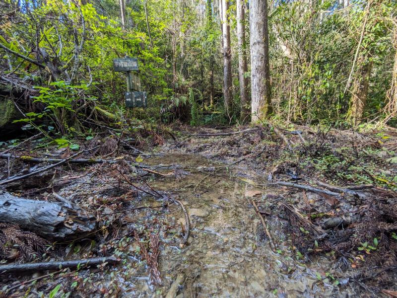 前日の大雨のため道は所々水たまりや小川のように流れている箇所がありました。今回はトレランスタイルで登ったため防水の靴ではありませんでしたが、一般的には防水の靴が適しています。