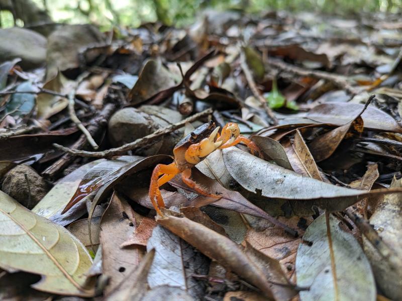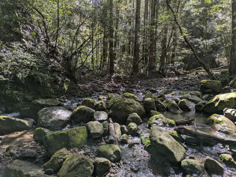 渓谷に下りてからは再び椿山森林公園まで登り返し。途中、サワガニに会いながら木漏れ日や渓谷からのマイナスイオンを感じながら気持ちの良いトレイルを進み、椿山森林公園へ。