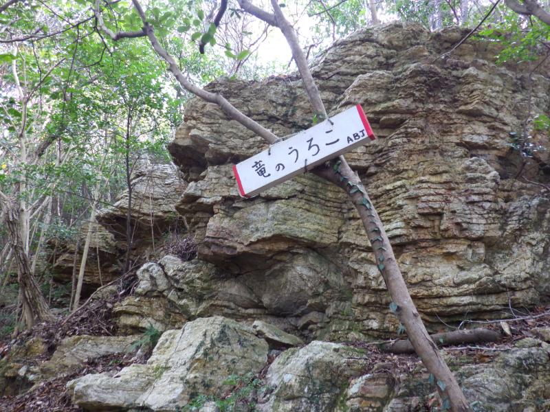 ⑤最初に竜宮バルコニーに向かいますが、林道が交差し、その上に登り口看板があります
