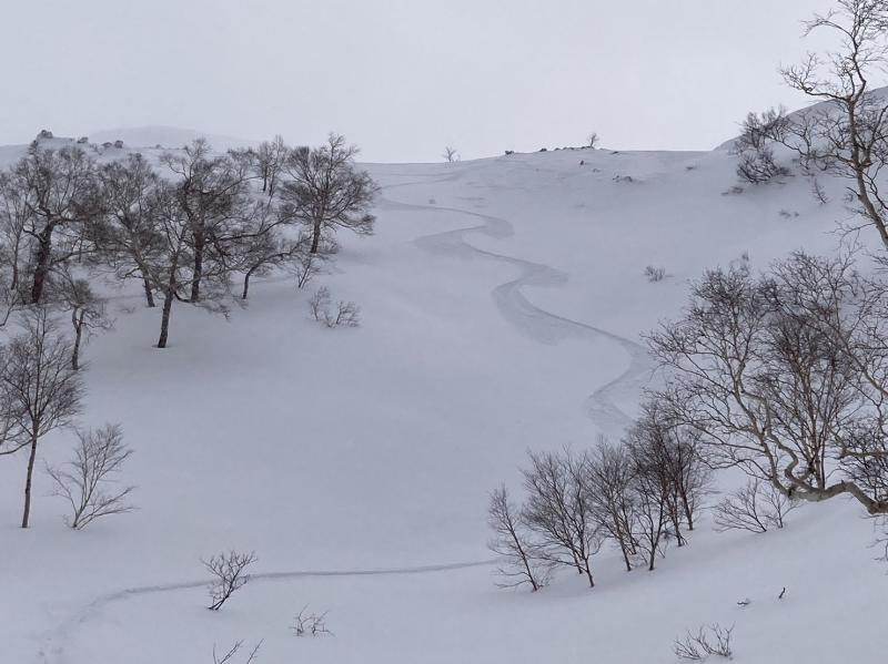 今シーズンラストかも知れないパウダースノーを噛みしめて下山。