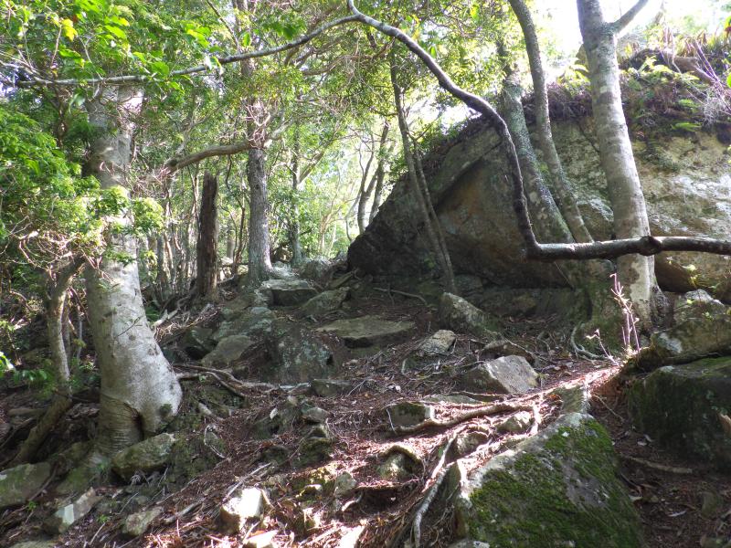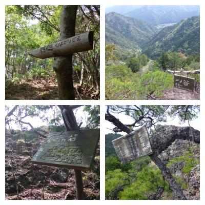 天狗の踊り場を過ぎると、シャクナゲと岩が混じったあやしい稜線ながらもそれほどアップダウンはありません。各ポイントには源平合戦になぞえた名前があり、2つの無名峰にも説明版があり、飽きが来ません。大岩が数回出てきて、巻道で迂回しないといけない所や馬の背のような細い岩場もあります。