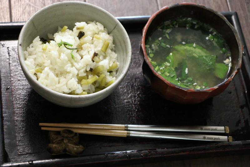 ⑥場所を移動して 山菜取り。コシアブラ、山椒、クレソン などでコシアブラごはんいただきました。