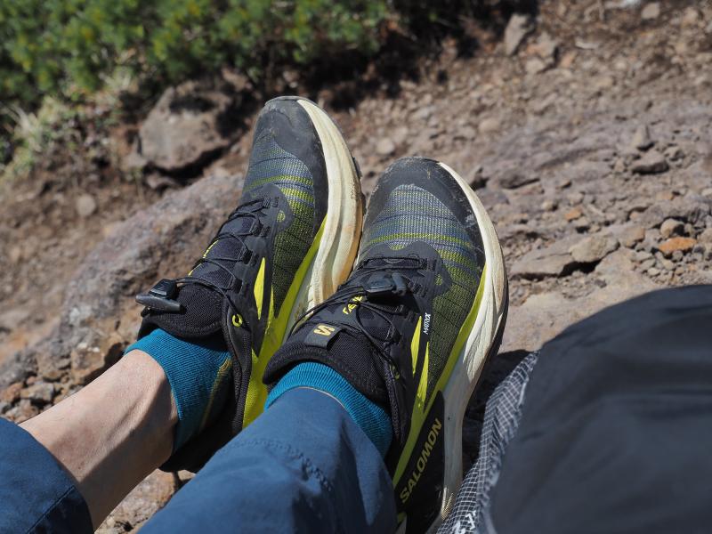個人的にトレランシューズを日帰り登山用のシューズとして使うので多少岩場があろうと一般登山道はガンガン行けないと困るのでグリップ力と安定感は重視しています。足形が合うのはもちろんのこと。今回のコースは序盤終盤は土、標高高いところは岩場でシューズをテストするにはいいところです。パートナーと歩いていたので走ってはいませんが、岩の上で踏ん張ってグリップさせないといけないところも滑りそうな不安感は全くなしでした。クッション性と安定感がよく足の疲れは少なかった印象です。アッパーのMatryx®が履き込んでいくことでどう変化していくのかが気になるところです。