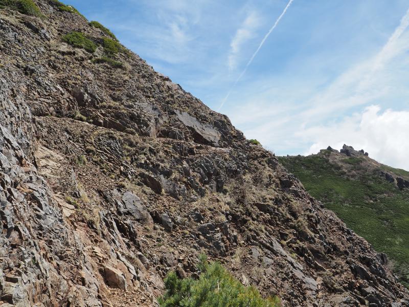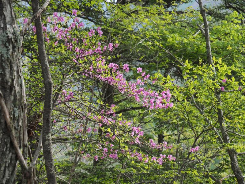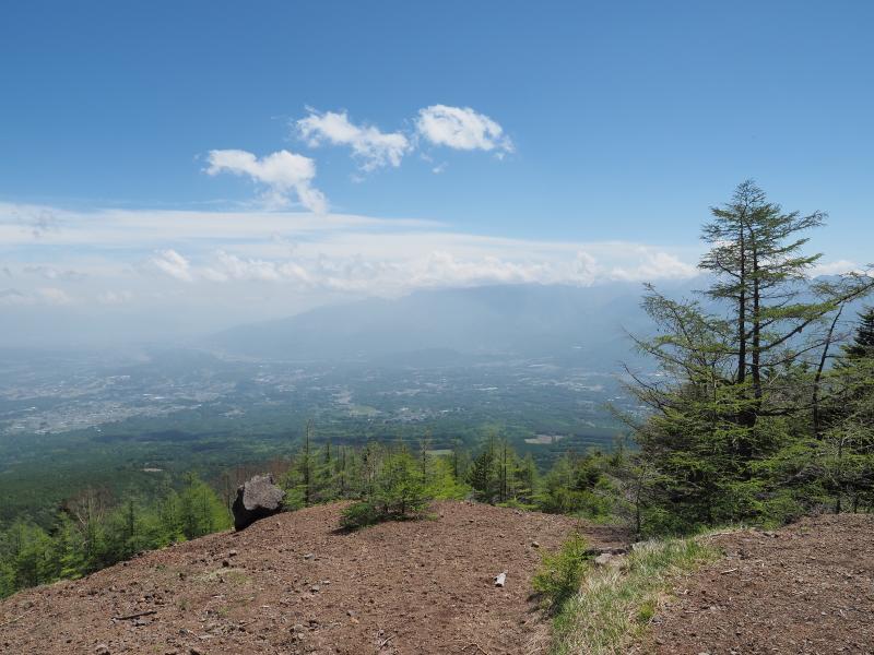 観音平から編笠山へ。土の道から始まり、苔の生えた岩の上を歩き標高を上げていきます。新緑が綺麗ですね。ミツバツツジが所々咲いています。登山道の合間から振り返るとちょっと雲はありましたが南アルプス、富士山はよく見えていました。