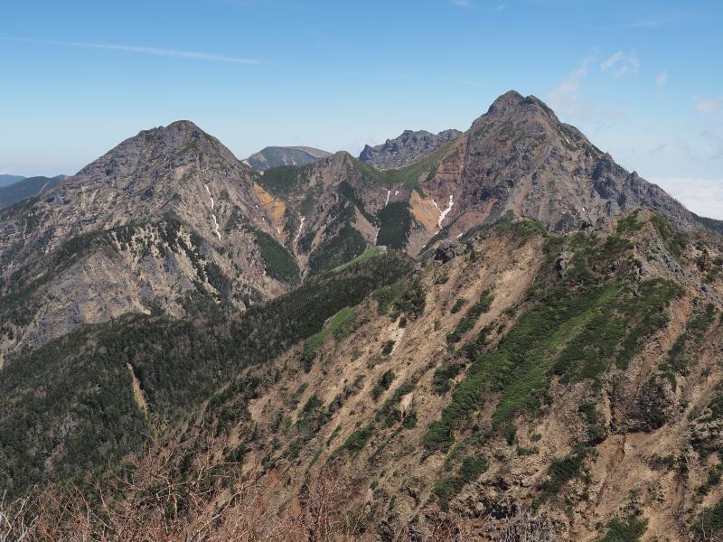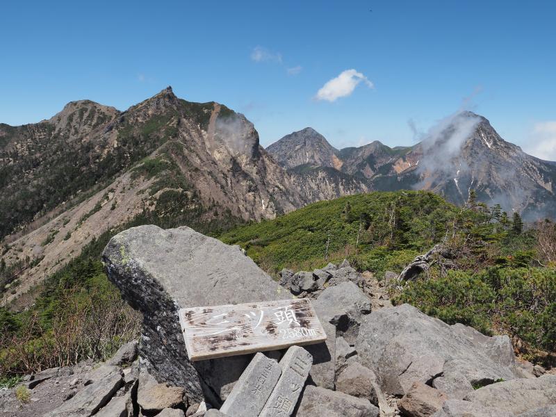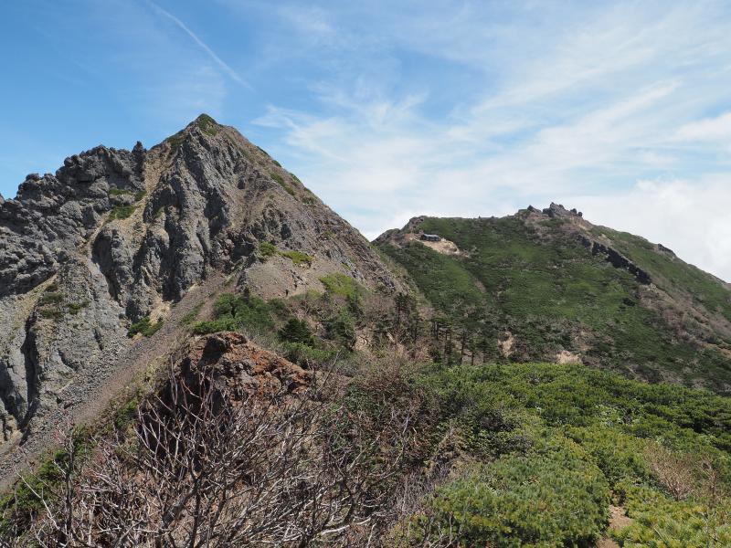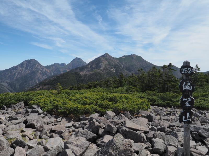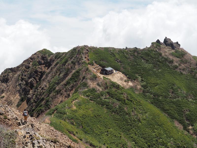編笠山に到着すると権現岳・赤岳~蓼科山と北側は綺麗に見えています。北東側は雲海っぽいですね。青年小屋に下りる途中は部分的に雪が残っていましたが、しっかり見て歩けば雪の上を歩かずとも通過できます。大きな岩の上をテンポよく歩き、久々の遠い飲み屋「青年小屋」を通過。