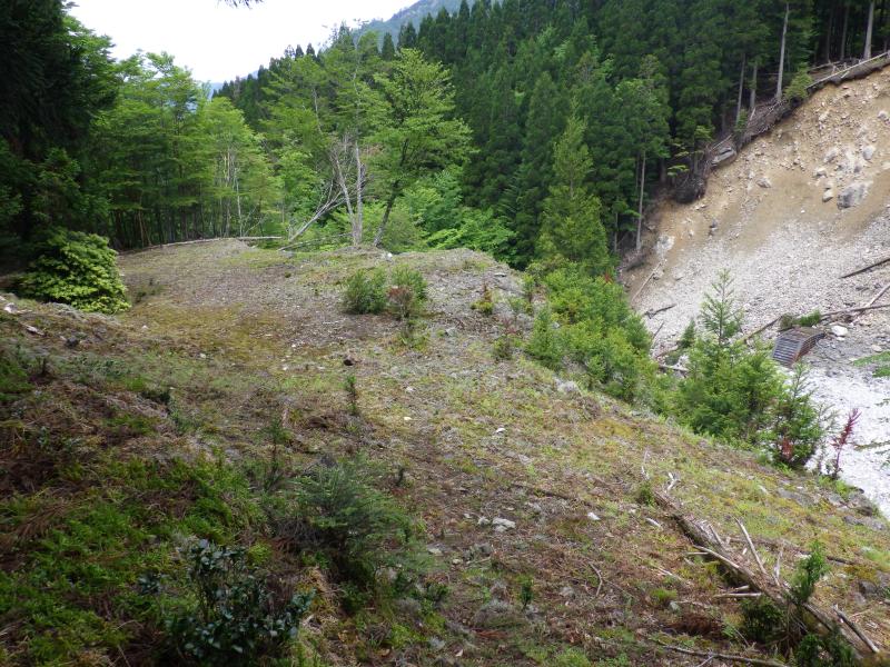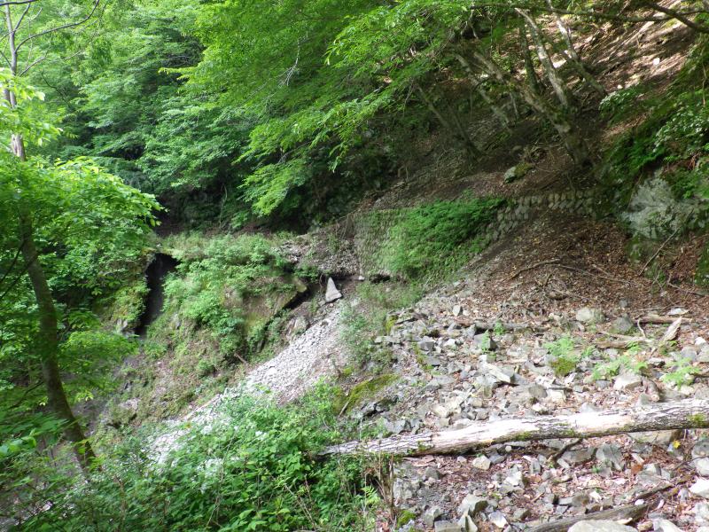 ④続く王子製紙私道林道は林道とは思えないほど荒れ果てていて、沢を渡る箇所はほぼ崩壊、土砂で埋まっています。特に前半に出てくる1か所は残置ロープが頼りです。