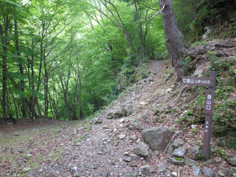 駐車地からすぐの舟ノ川の渡渉対策でサンダルを用意していましたが、水量も少なく、そのまま登山靴で少しだけ濡れながら、クリア。さらにもう一回の渡渉は支流の谷でしれいました。その先で林道に入り、すぐさま、崩壊箇所がでてきます。ここは崩れた斜面にある残置ロープでザレ場を越えていきます。ここまでが林道の核心部。そこから七面山登山口までショートカットしながら、土砂で埋もれた林道を進みました。