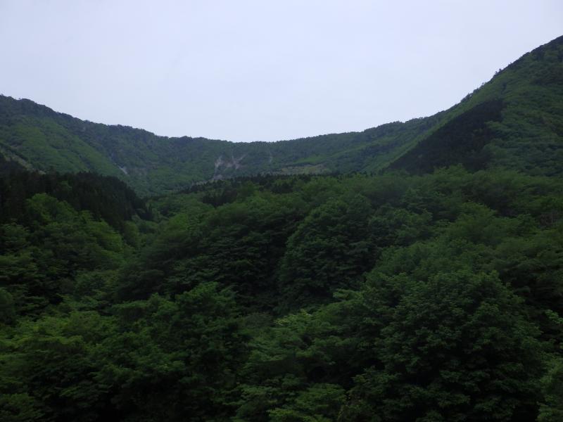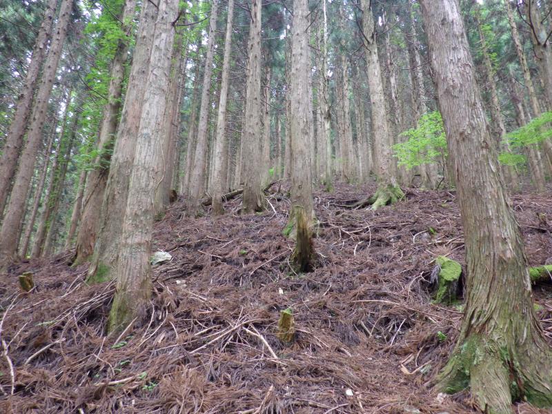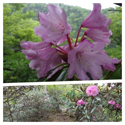 ようやくまともな登山道を七面山へ、大峰らしい急な樹林帯の尾根。この尾根上ではシャクナゲと遅咲きのアカヤシオが見られましたが、なんとツキノワグマの子供にも出くわしました。20m近くの至近距離で肝を冷やしましたが、目が合うやすぐに逃げていきましまた。全く油断していましたが、過去の記録でも出没しているようで、調査不足でした。