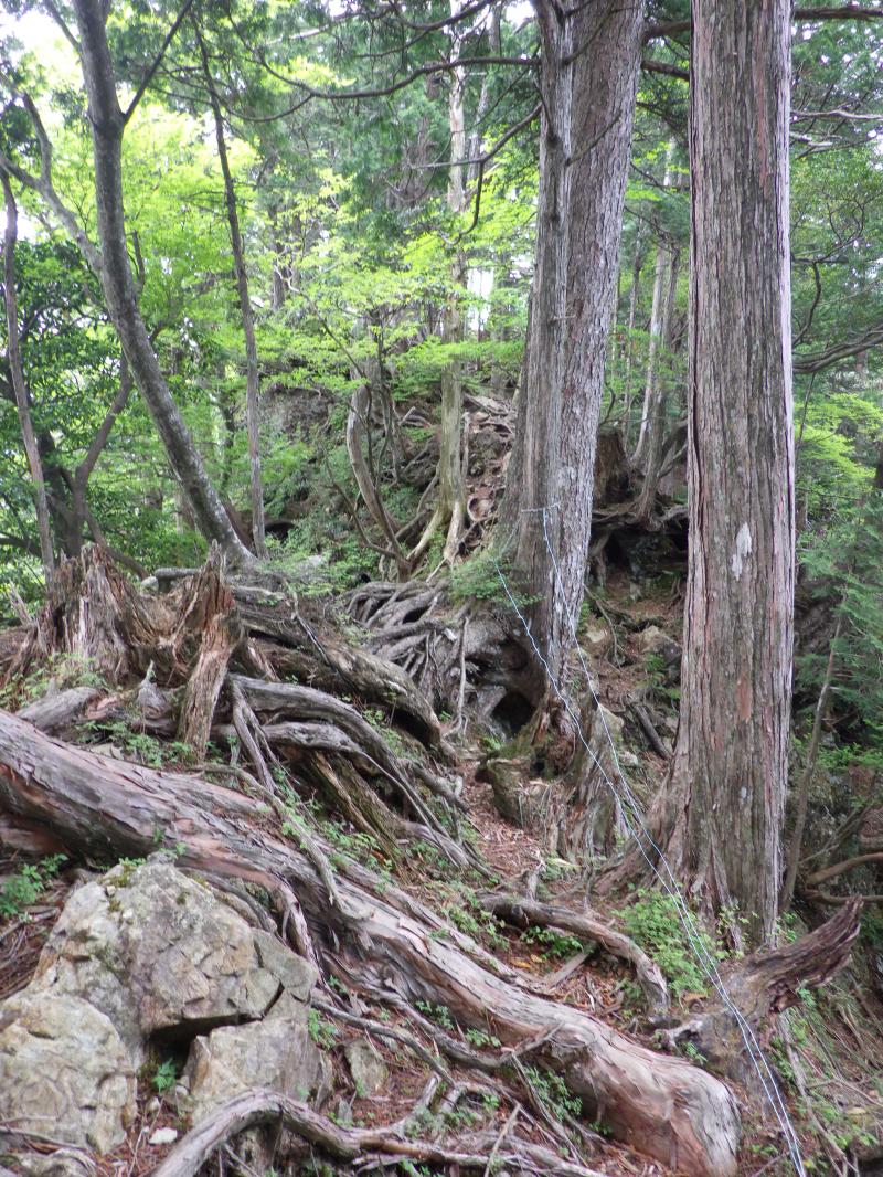 ⑪楊枝ノ森付近の奥駆道はトラバースで巻いています。明星ヶ岳側へ尾根を下って行けば、奥駆道へ出られます