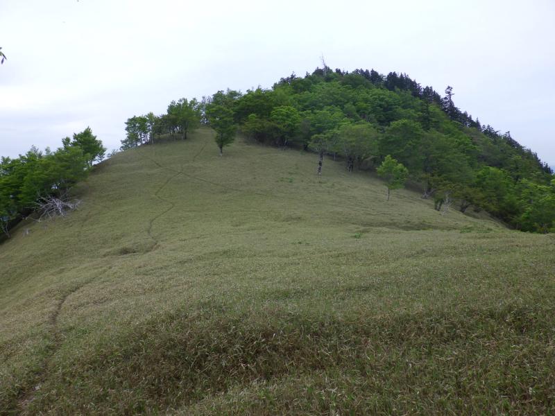 右の槍ノ尾ノ頭方面へいやいよアケボノ平へ向かいますが、笹の草原が広がり、新緑もきれいでなかなかいい所です。草原の向こうには大峰主稜線の釈迦ヶ岳が見えていました。