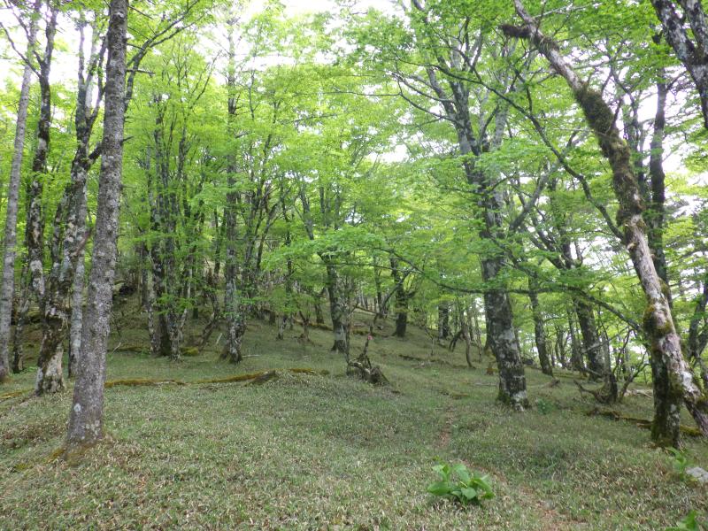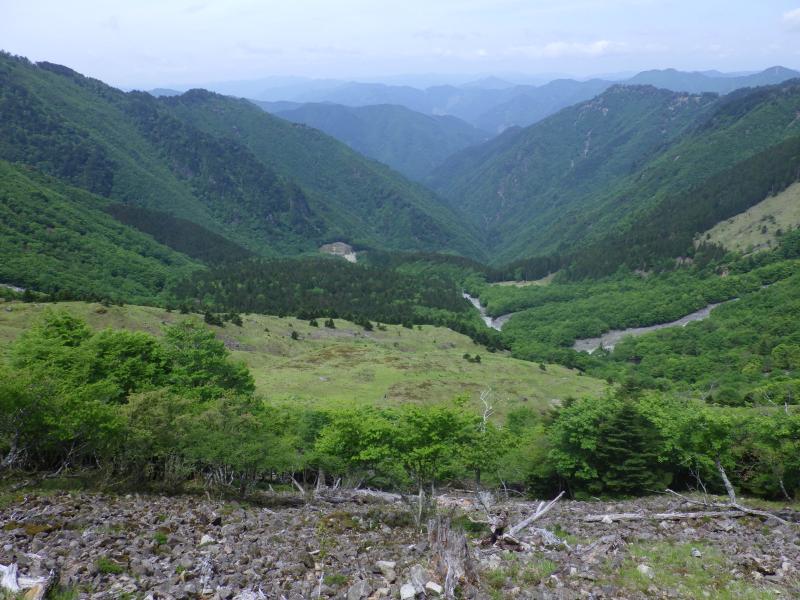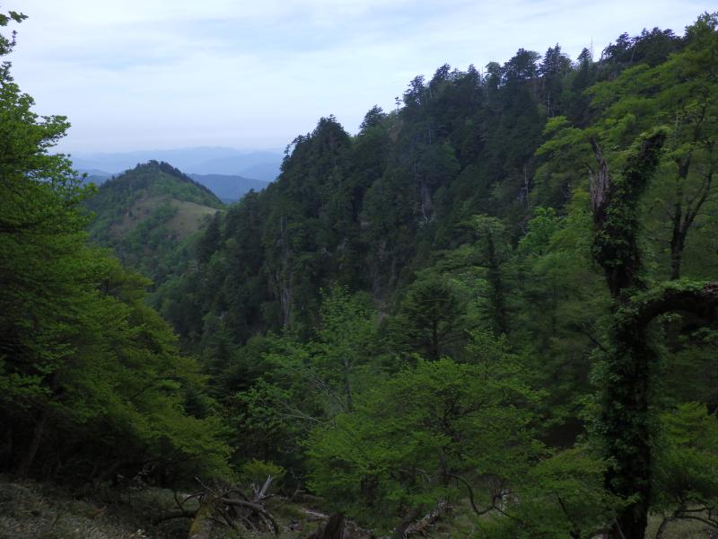 この辺りまで来ると大峰の主稜線が目前ですが、この稜線も新緑がきれいで、早くもシロヤシオが見られました。先ほどのアケボノ平のように新緑がきれいな優しい稜線でいい所です。楊枝ノ森に到達すると、今度はバイケイソウの森で咲いていませんが葉っぱが大量で覆いつくされています。ここから正面に明星ヶ岳と八経ヶ岳が見えます。この辺りは大峰でも優しい稜線で樹林帯をトラバースしながら進む稜線です。はもうこの稜線の西側に広がっていますが、どこから下ったらいいのかよくわからず、舟ノ垰を一旦は越えて、展望が効くガレ場から覗き込みました。下の方に見える高原のような台地を確認し、戻って、できる限り尾根を下っていきます。途中でガレ沢が出てくれば、避けるように尾根道へ尾根道へと下って行くと、台地になんとかでました。ここだけが樹木もない台地になっていて、まさに神々が舞い降りるという伝説の地でした。振り返ると大峰の主稜線が見え、登ってきたならば、あの稜線めがけて、適当に登るのだろうなと思いました。