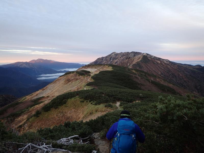 ⑬神仙平へは登山道はありませんので、舟ノ垰周辺で神仙平へ向けて下るのみです。沢は急なガレ沢なので尾根を下った方がよいです