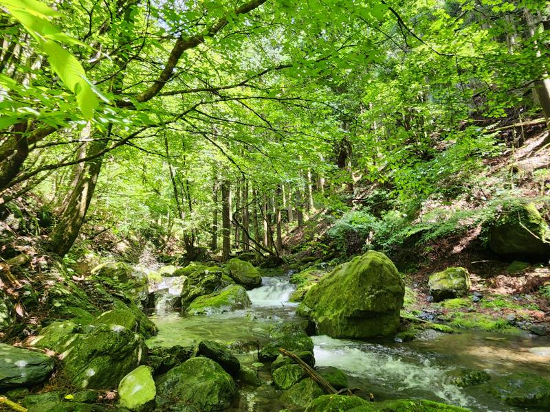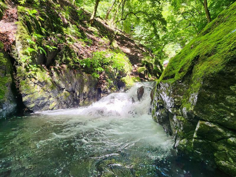 緑が綺麗な流れの中を歩いていると最初の小滝が現れました。初っ端だからそんなに深くないだろう。そう思って進んでみると太腿まで潜り少し焦りました。