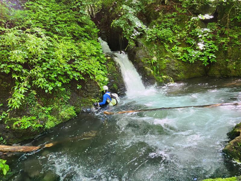 ・滝壺はどこも深くへつる時足がつかない箇所もありました。胸元まで浸かるので猛暑でも低体温になります。レインウエア着用しての遡行がおすすめ。