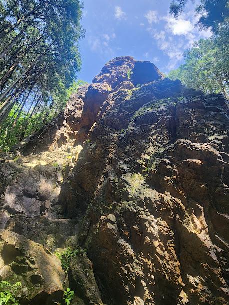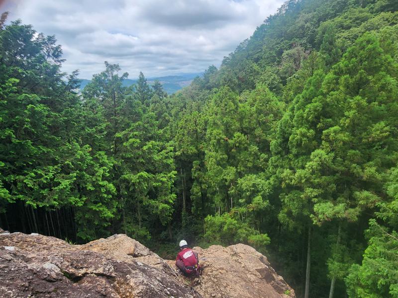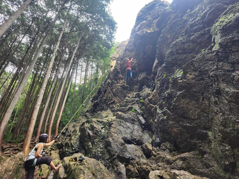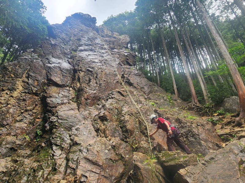 ぬかるんだ道を滑らないよう慎重に歩いて、やってきたのは高さ20mほどの男岩。隣には同じ規模の女岩があり、年間通して良く登られている岩場です。休日には大変混み合い、ロープが簾のようだと揶揄されているほど。この日は雨上がりでしかも蒸し暑く、コンディションが悪かったのでさすがに誰もいませんでした。
