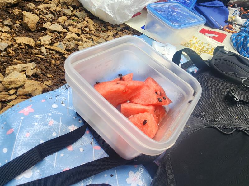 登り放題ですが、岩は乾いていないし暑いし、快適なクライミングとは言えません。キンキンに冷えたサイダーが飲みたいとぼやいていた所へ、知り合いがスイカを差し入れてくれました。早速いただいて息を吹き返し、今度は南面から日影の西面にトライ。バルジを越えて直登したかったですが、掴んだ岩は濡れていて結局右の凹角へ逃げてしまいました。悔しかったので再トライしましたが、濡れた感触を克服できず、またしても登りやすい右に寄ってしまいました。先ほどよりはやや難しいラインを登ったのでまずまずの出来です。