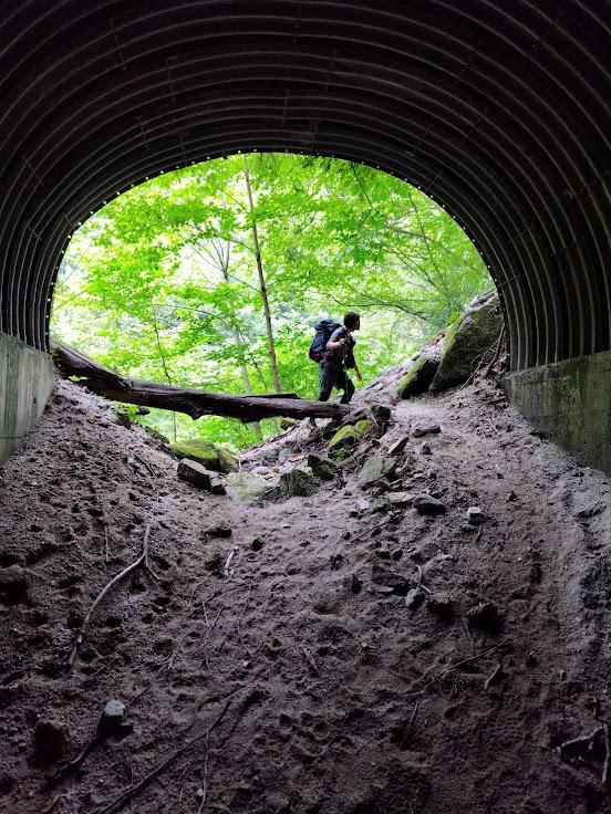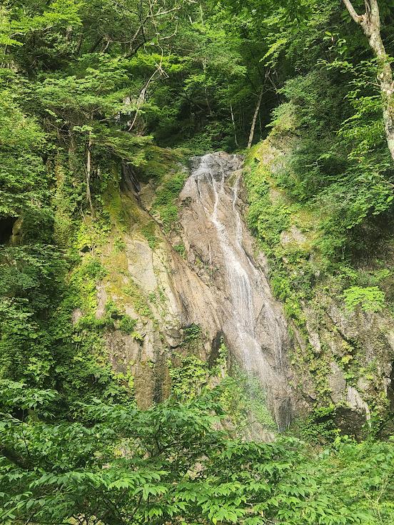 ・矢立石からそのまま閉鎖されているゲートを進むと錦滝があります。崩落した林道を歩きトンネルを3つ越えてから、沢に急降下するロープの張られた踏み跡を下りきると入渓できます。