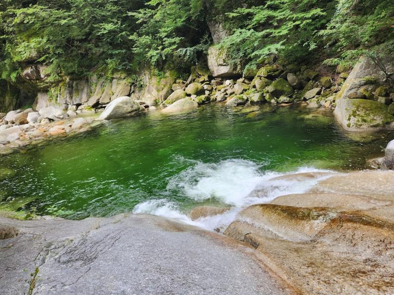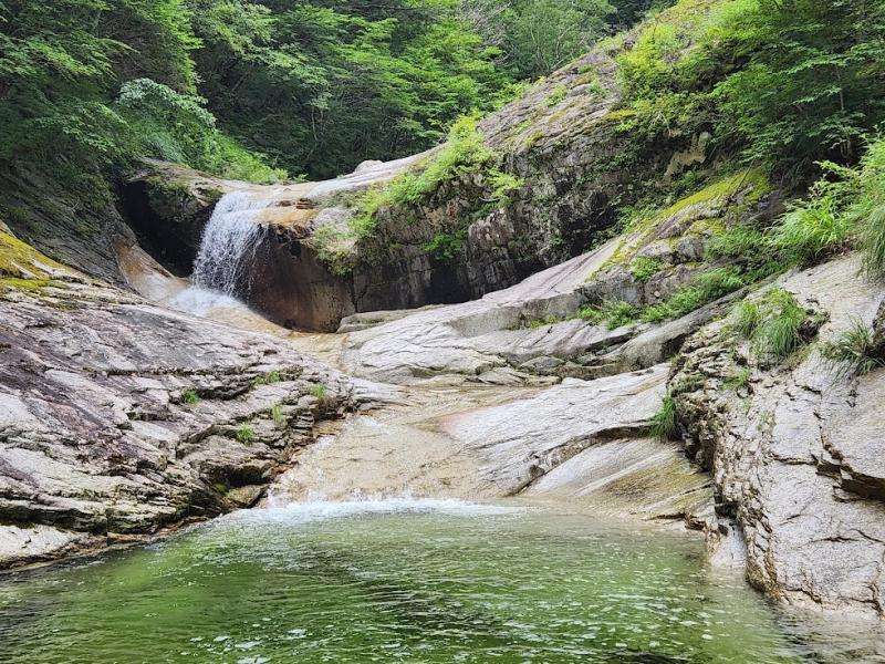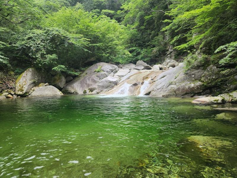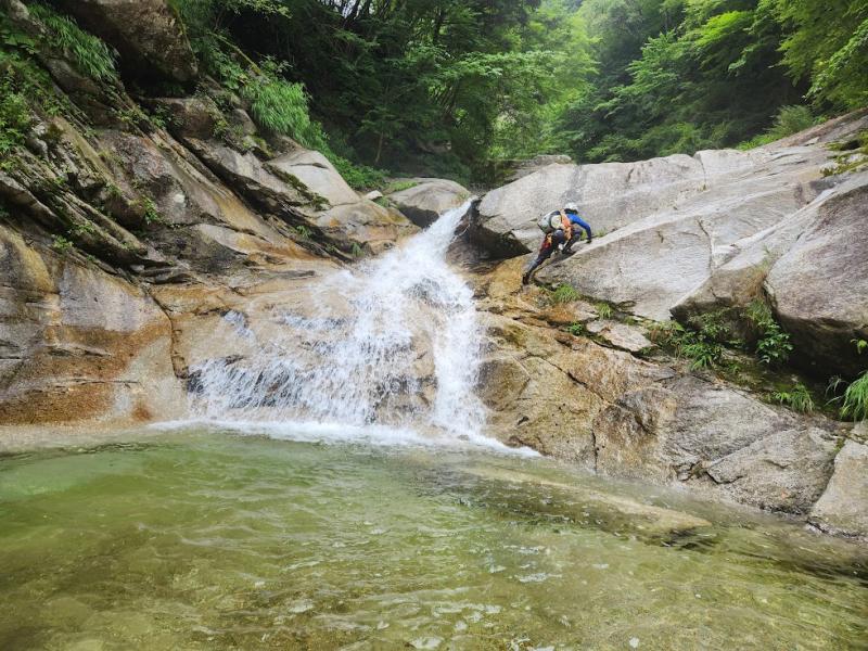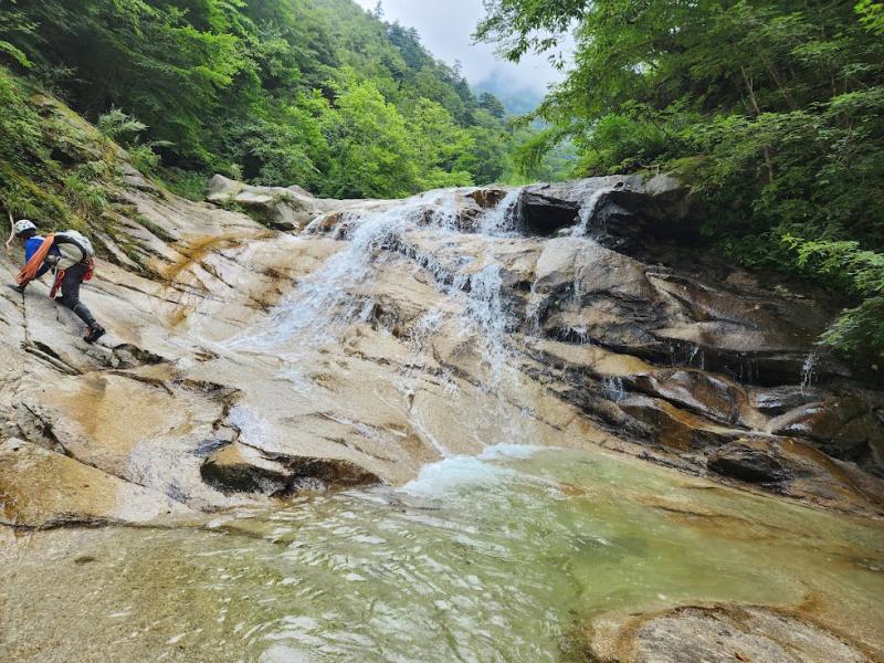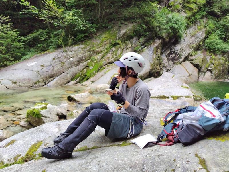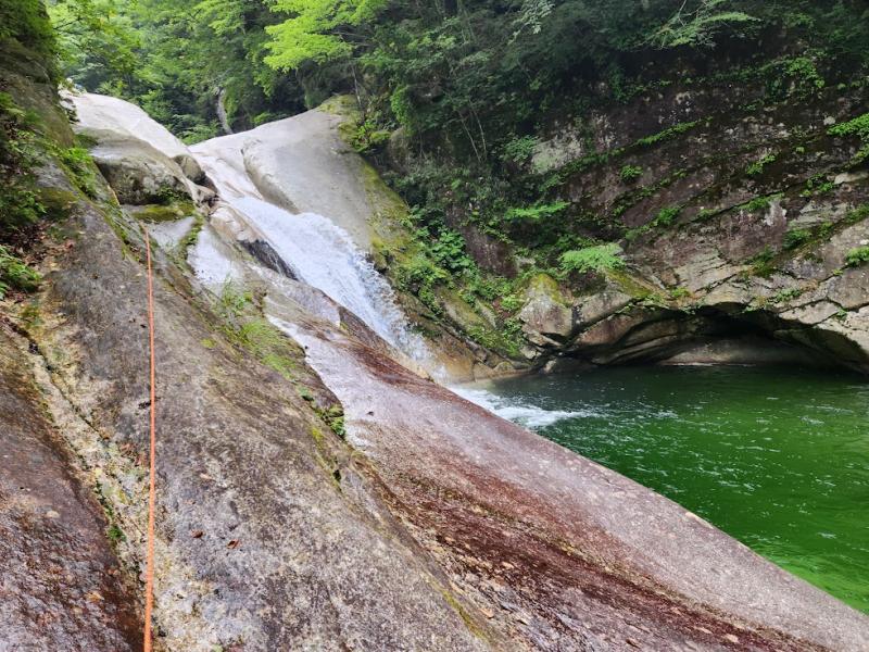 装備を身に付けいざ入渓。程なく有名な夫婦滝が見えてきました。上下二段のナメ滝で、釜がうっとりするくらい綺麗なエメラルドグリーン。見たかった光景に遭遇してはしゃぐのも束の間、ナメをいかに滑らずに通過するかいきなり正念場です。滑ると思うと絶対に滑るから、何も考えずにしがみつくのが突破の極意だとか。私はツルツルの足下にひぃひぃ言いながら、薄いフレークでもカチでも必死にしがみついて登りました。