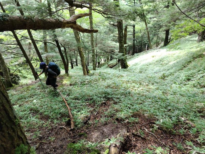 ・乗越沢の最初の滝は滑るので右の立ち木で中間取りながら登りました。その後は左岸の巻き道を行けば沢筋がみるみる小さくなっていきます。踏み跡ありますが急な上、アザミが群生しているので通過するとき痛いです。