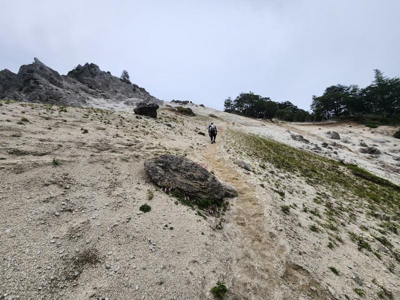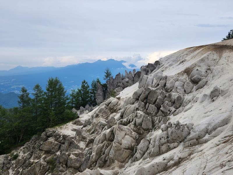 ようやく登山道に合流すると、鞍部から北杜市の街並みが見えました。標高は2000mを越えていたので道理で遠くの街が見えるわけです。ずいぶん登りました。今度は日向山を目指して400mほど下ります。リッジ状の場所もあれば手がかりのないスラブもあります。穏やかな日向山に向かっているはずなのに、なぜ微妙に悪路?と思っていたら、ここは鋸岳からの縦走路ということで納得しました。