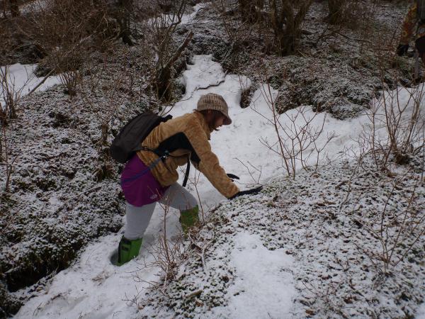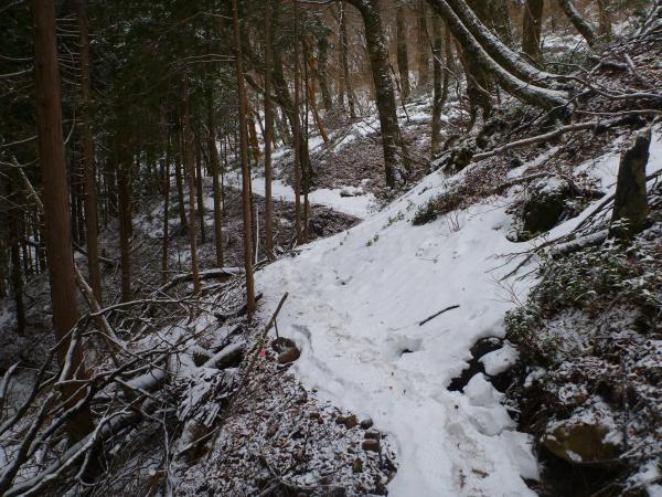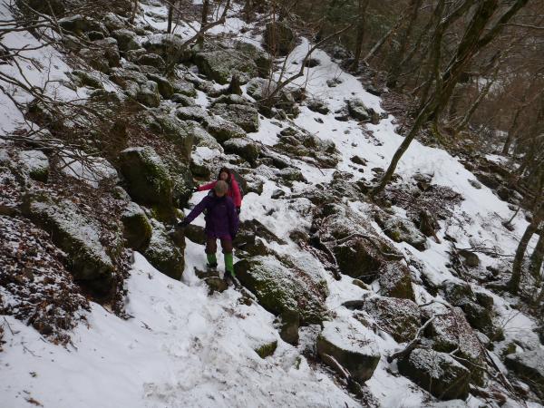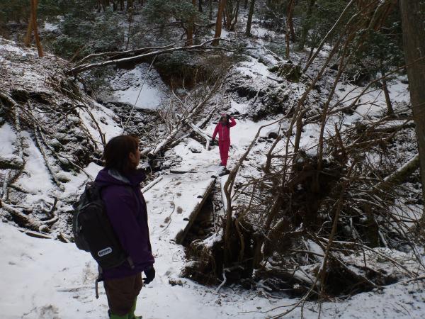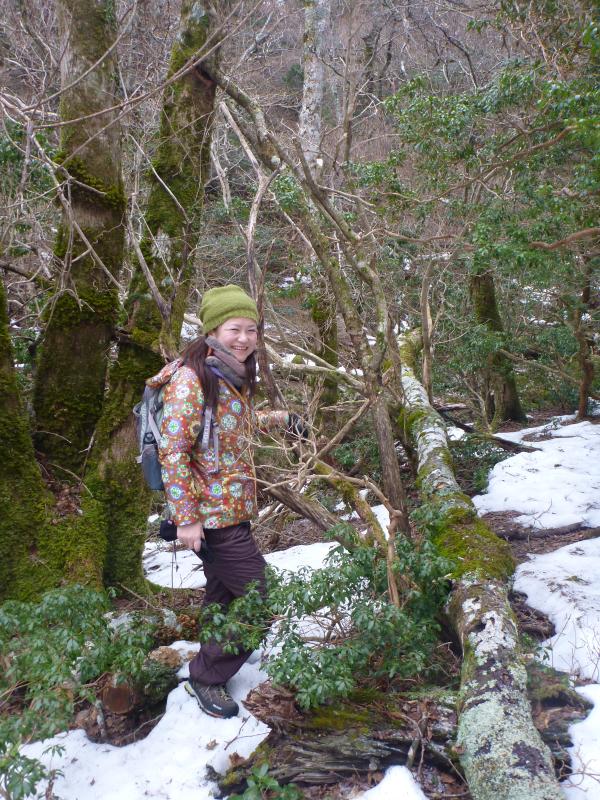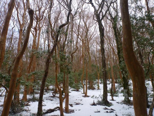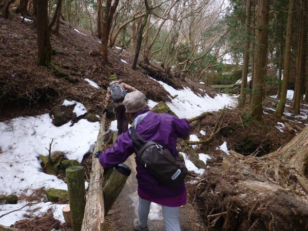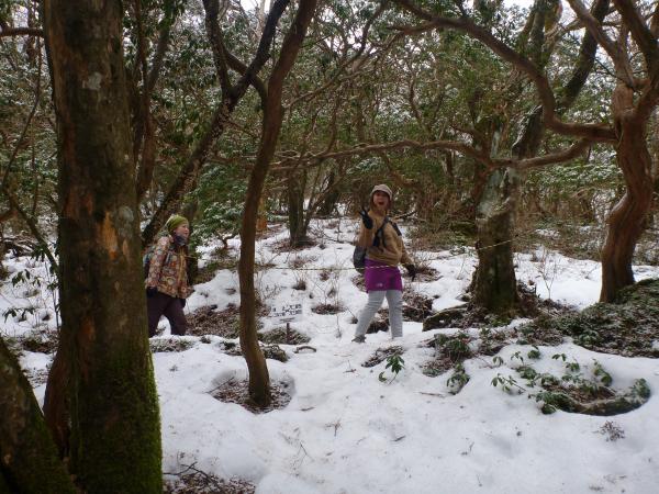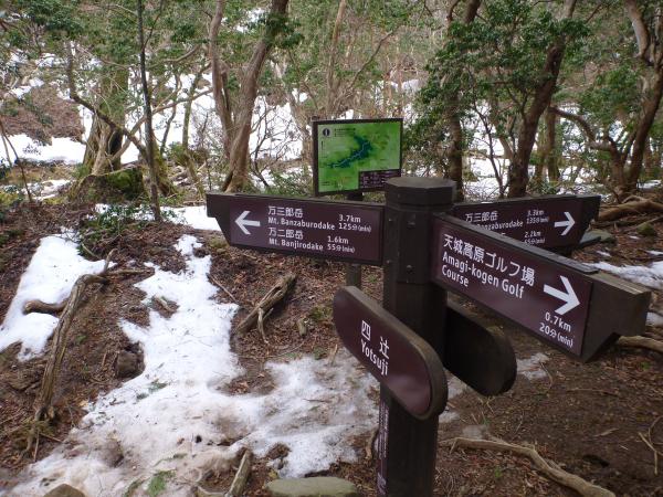 - 四辻(万二郎岳登山口)からは、登山道がほぼ雪に覆われていた。当日は、気温かそれほど下がらなかったのでザクザクした雪で歩きにくかった。気温が低ければ雪が硬くなりアイゼンが必要でしょう。特に下山路のシャクナゲコースが、日影が多いので雪が多く残っていました。この時期はアイゼンが必要です。