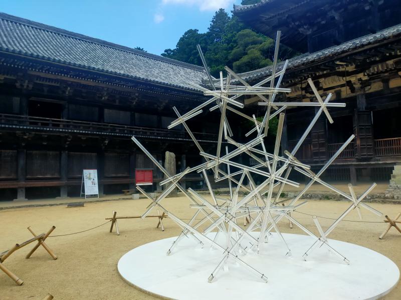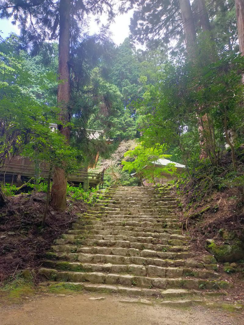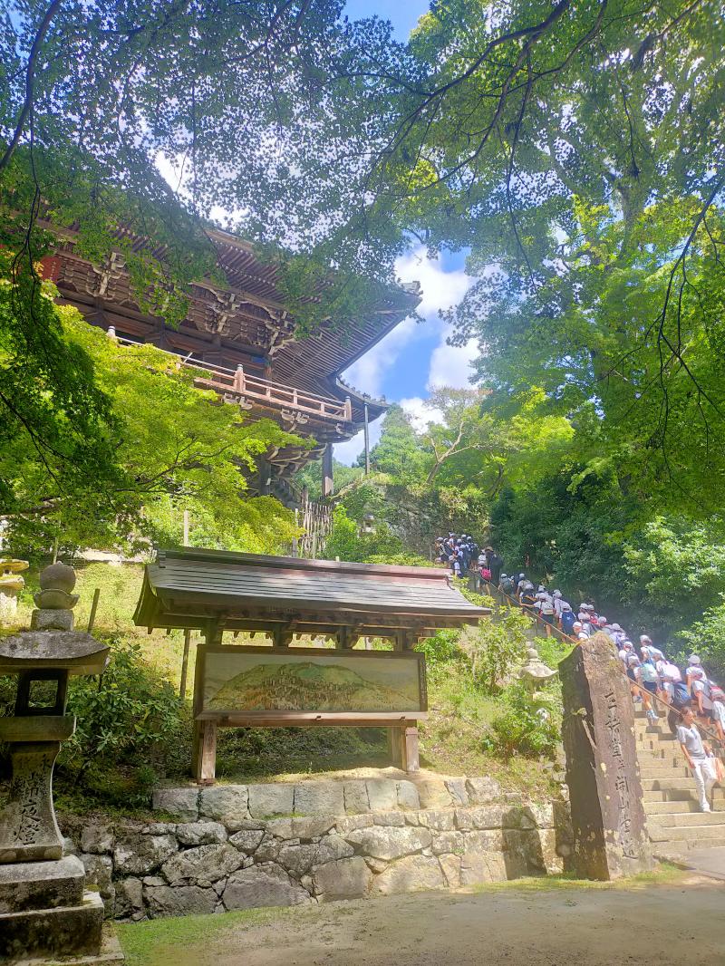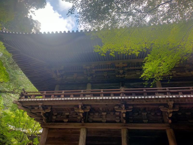 いつもの定位置の摩尼殿前ベンチで休憩。上のもみじはまだまだ青かったです。摩尼殿では小学生の遠足で賑やかな声。子供は元気だなーと実感。