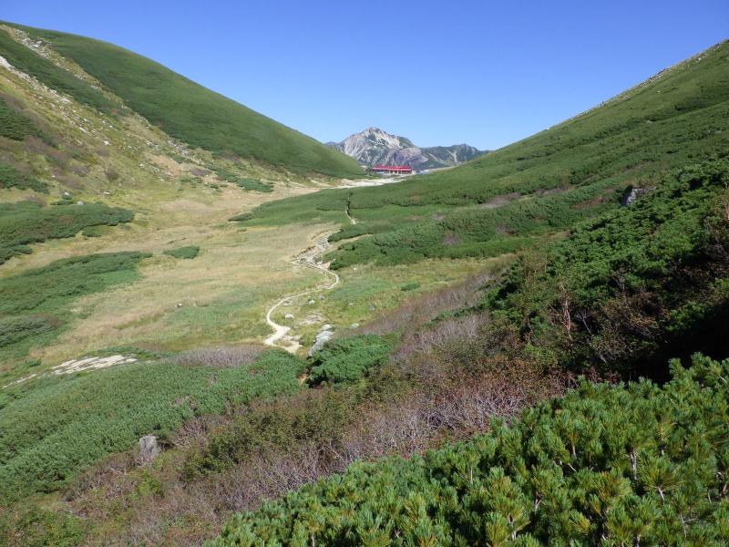 この中道は双六岳を登らないだけで、ショートカットにはなっていませんが、双六台地から見る槍ヶ岳もまたきれい。今日は全くガスで隠れることなく、かっこいい姿がずっと拝めて満足です。ただ、紅葉はほとんど進んでいない感じで、これは以前と違うとこです。