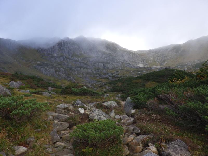 次の日は黒部五郎岳をピストンした後でテントを撤収し、下山しなければなりませんので、早々と就寝。次の日は3時出発のヘッドランプ行動です。朝、ひんやりしています。カール内はマーキングが頼りで何とか日の出前に山頂に到着。しかしながら、ガスで何も見えません。日の出の時刻、うっすら太陽が覗き込みしたが、山肌は何も見えず、しばらく粘ってもだめでした。ここで油をうっている暇はありませんので、急ぎ帰ります。カールまで下ると、ガスが晴れたりするので、カールの先の黒部五郎岳がきれいに見えます。