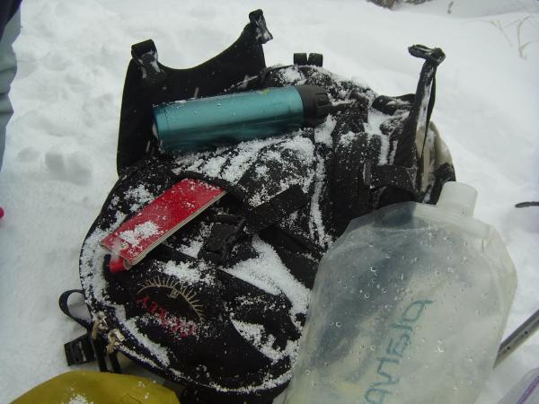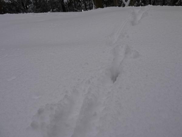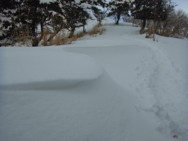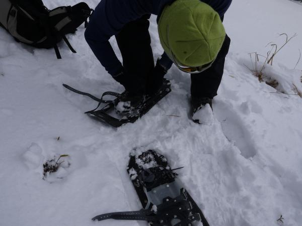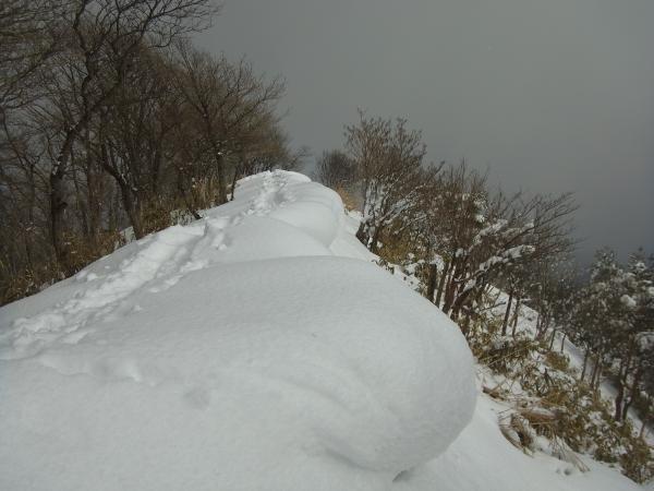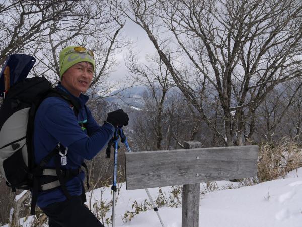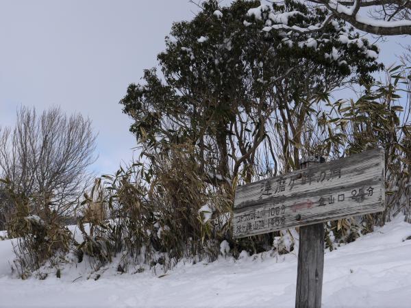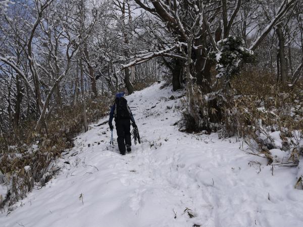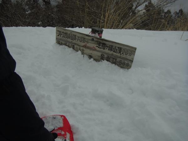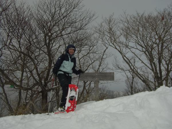 登山口から達磨ヶ峰の肩までは勾配がきついことと、積雪が少なめなのでツボ足で登りました。稜線は新雪が積りスノーシュー向きのいいコンディションです、達磨ヶ峰の肩でスノーシュー装着。