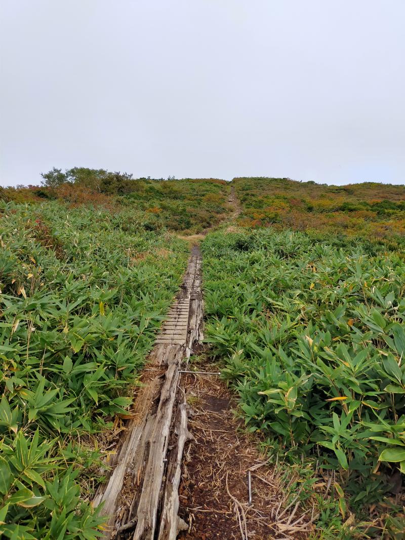- 水を3回渡ります。雨の後は水量が増えて登山道も水が流れている箇所やぬかるみがありました。山頂から避難小屋まで少し木道もあります。大きな幅の段差もあります。