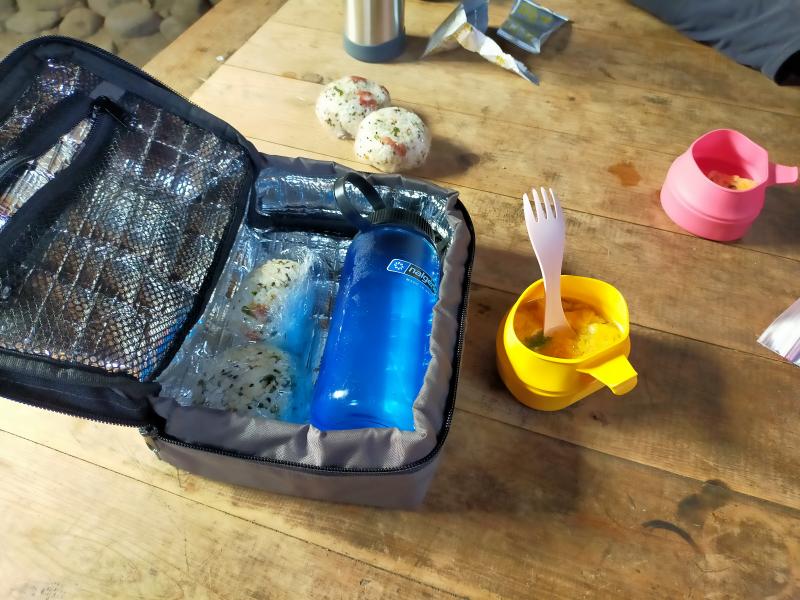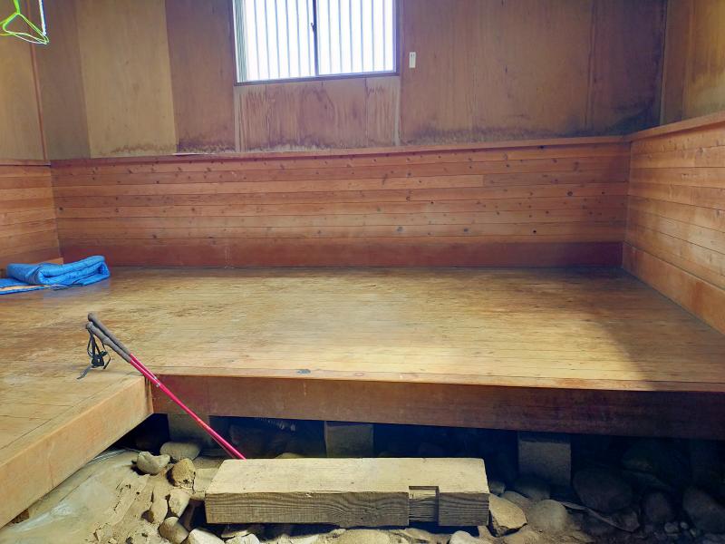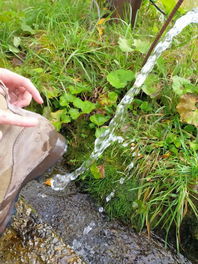 避難小屋でのランチは靴を脱いでしっかり休憩&ストレッチ。靴やストックの先ゴムがかなり汚れたので、第二駐車場の入り口にある水で、軽く泥汚れは洗い流しておきました。