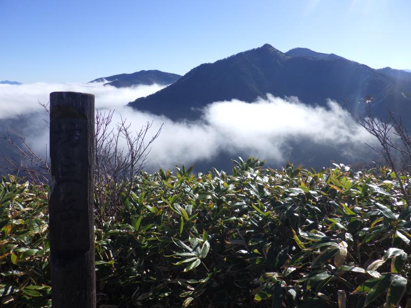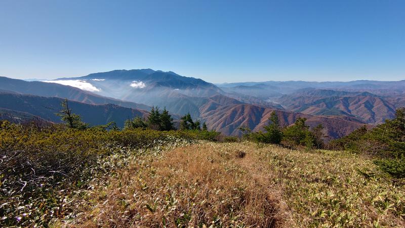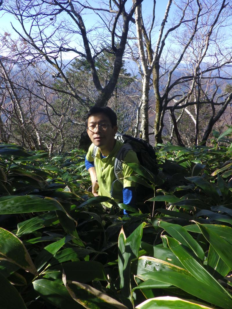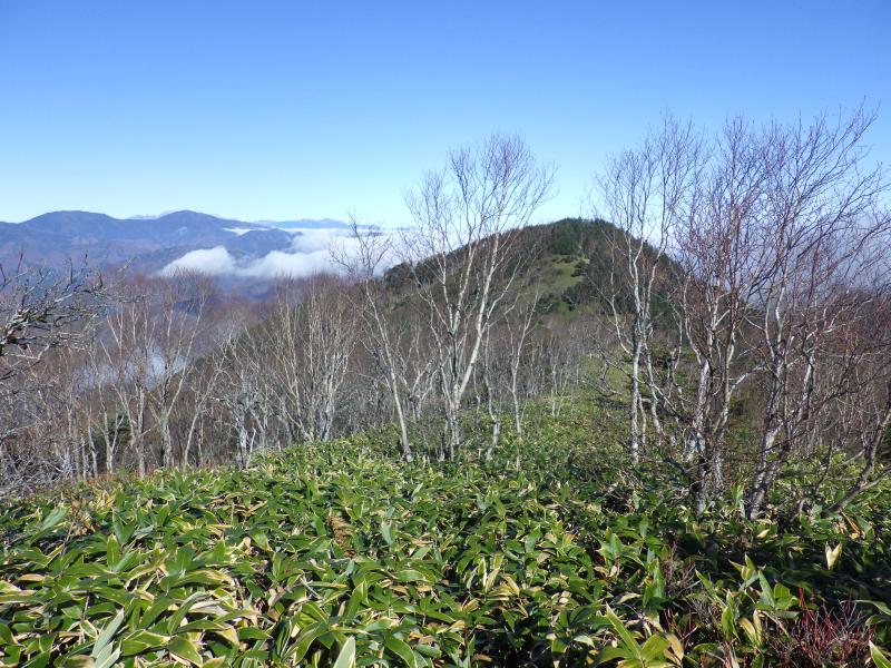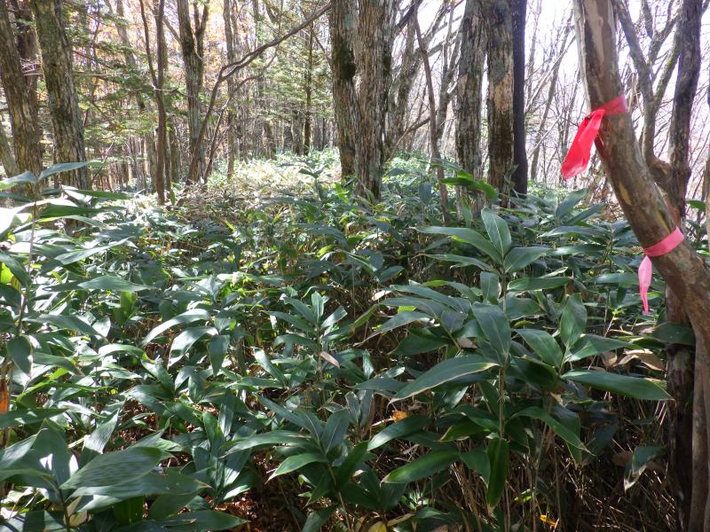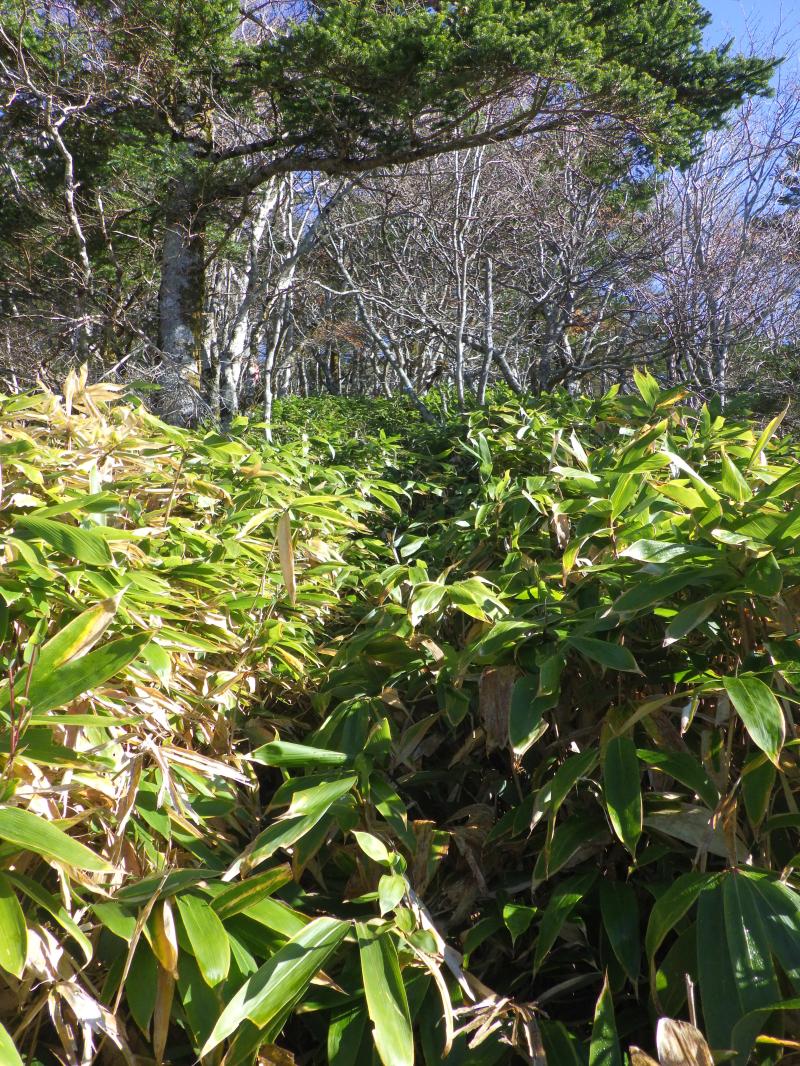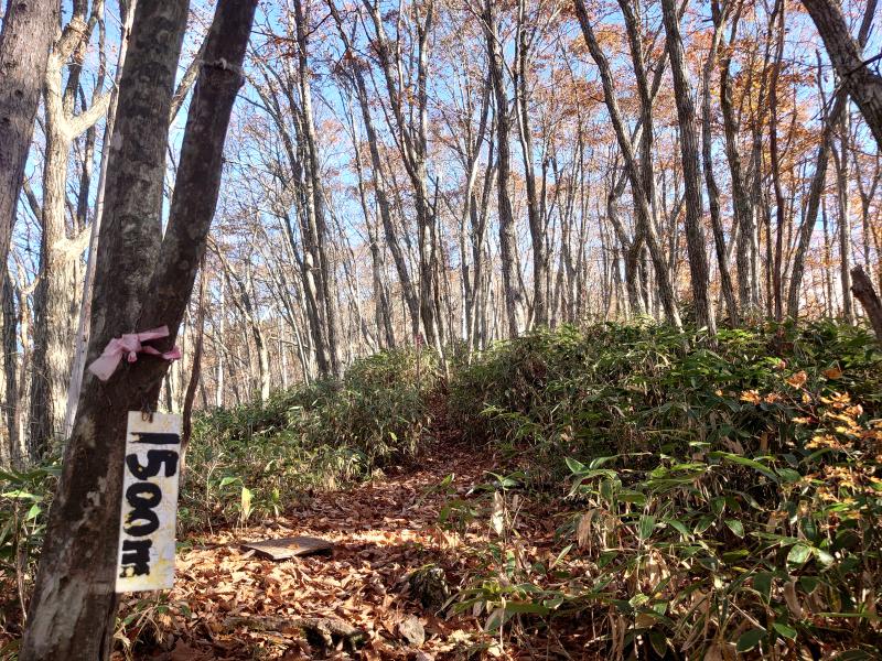 その先、1500m付近から笹が高くなり、背丈と同じくらいになり、山頂直下まで続きます。登山道ははっきりしているので見失うことはありませんが、急登と笹こきはつらいかもしれません。11月中旬で朝だと朝露などでここの笹は濡れていてベチャベチャになる覚悟はしていましたが、今年は本当に暖冬でそんな雰囲気は全くなく、逆に暑いくらいで回避できました。