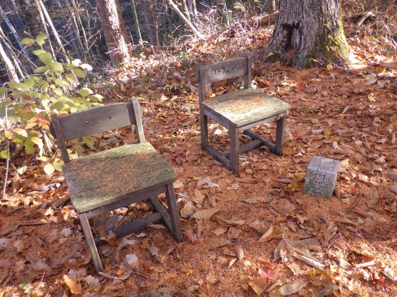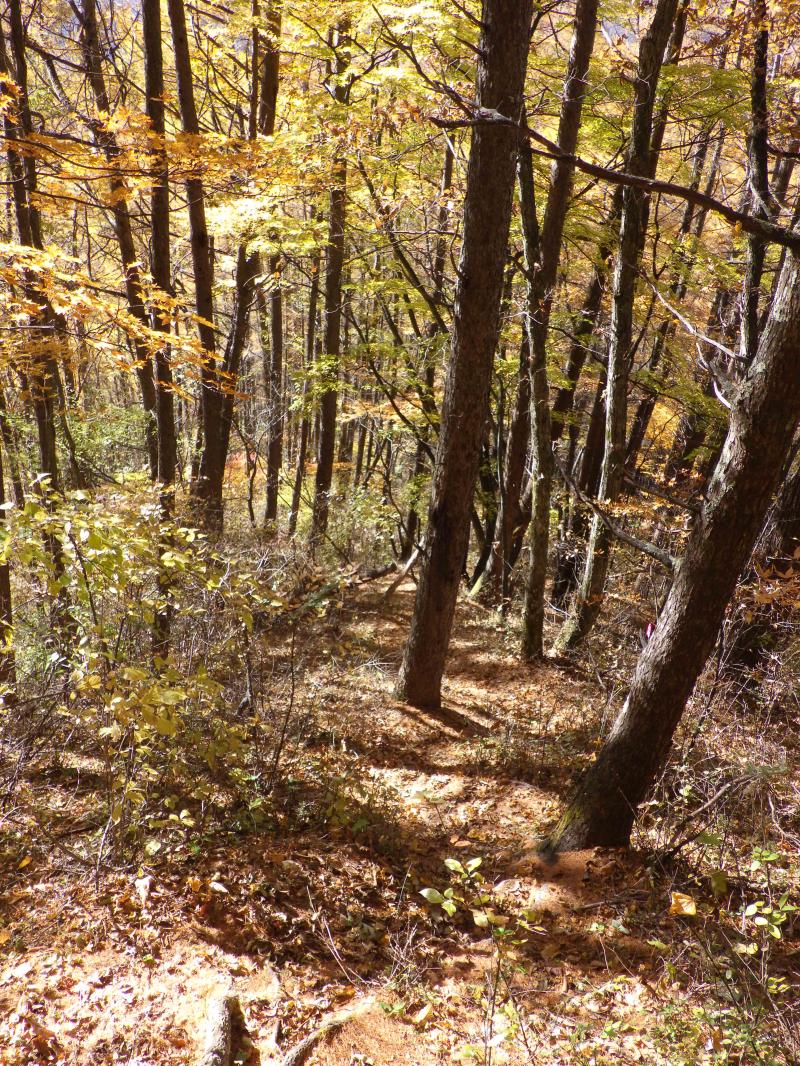 登山口からいきなり急登で尾根一辺倒の登山道が続き、下部は紅葉が見頃でなかなかきれいです。第一ポイント小坊主岳1429mにはかわいいベンチがちょこんと置いてあり、一休みするには絶好の場所で、見上げると樹木は紅葉に染まります。