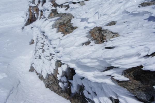 - 特に危険な箇所はありませんでした。所々に雪庇が出来ていますので近づかないよう気をつけて下さい。登りは全般的にスノーシューが活躍します。下りはアイゼン・ピッケルを使用して下さい。